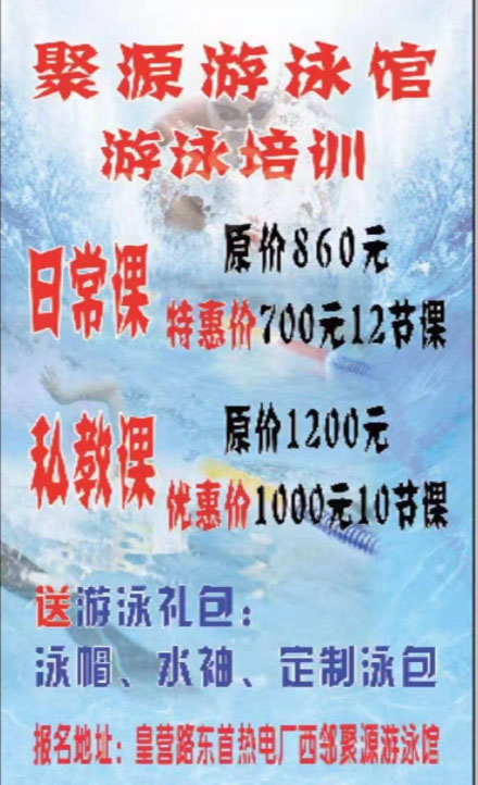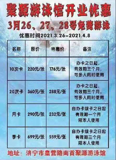 聚源游泳館將于2021年3月26日迎春開(kāi)館,為答謝新老客戶(hù),聚源游泳館開(kāi)業(yè)之際3月26-4月8日所售游泳卡一律八折優(yōu)惠。開(kāi)業(yè)前三天3月26日-28日免費(fèi)游泳啦!敬請(qǐng)廣大朋友相互告知,共赴盛舉。